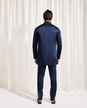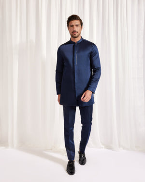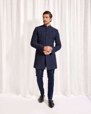 Navy blue self embroidered short achkan with all over hand french knot embroidery with tonal swiss rawsilk under kurta and tonal linen satin slim pant