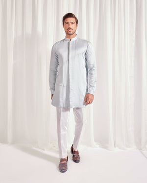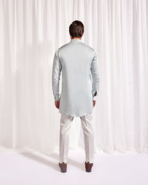 Powder blue self embroidered short open achkan with allover hand highlight teamed with tonal linen satin front open kurta with pintucks detail and tonal linen satin slimpant.