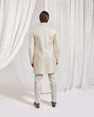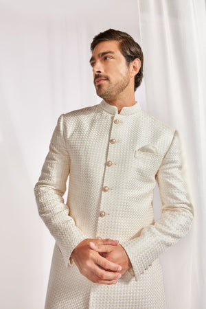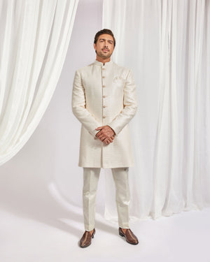 Ivory self embroidered classic achkan with hand highlighted collar teamed with tonal swiss raw silk underkurta and tonal swiss raw silk slimpant