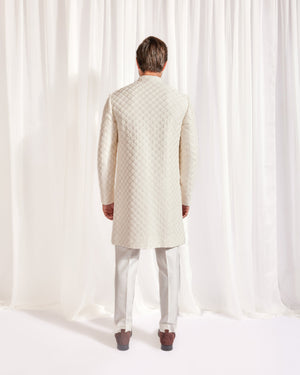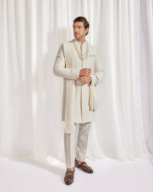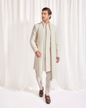 Ivory self embroidered classic achkan with all over hand highlight teamed with tonal swiss raw silk underkurta and tonal swiss rawsilk slimpant