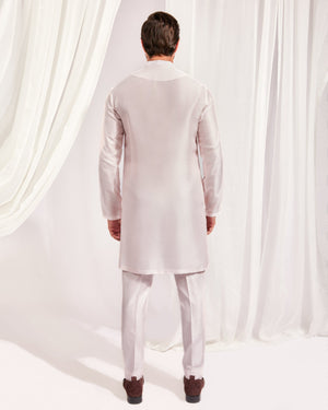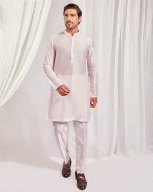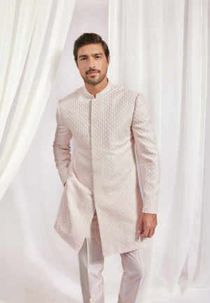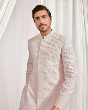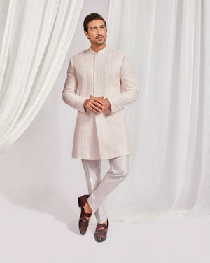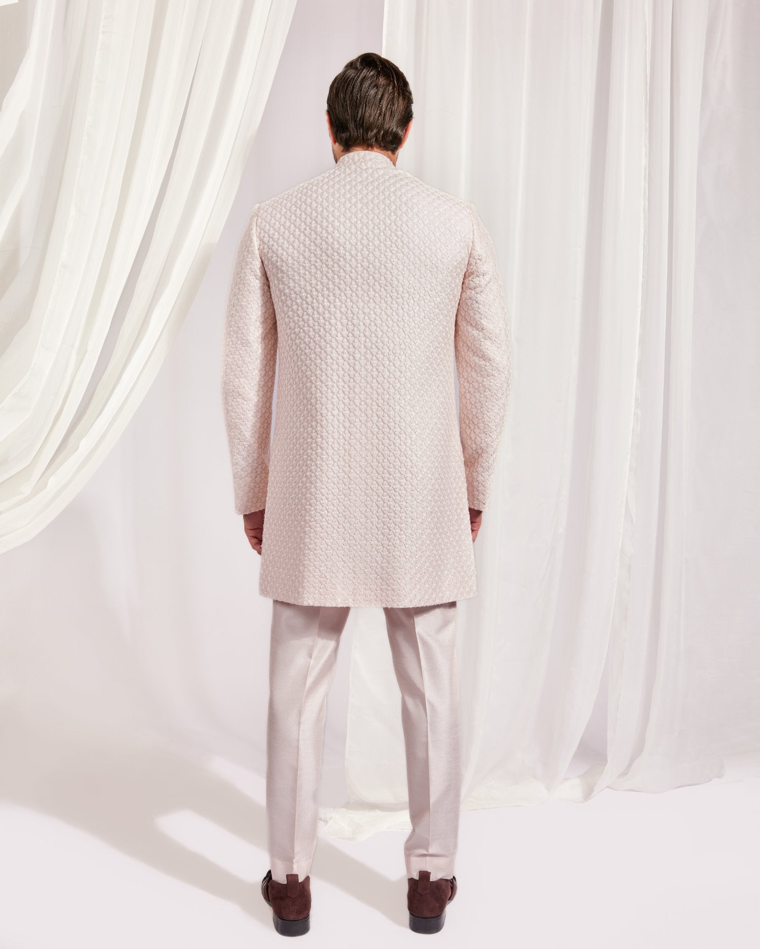 Powder pink self embroidered classic short achkan with concealed button and with allover katdan and pearl handwork highlight teamed with tonal swiss rawsilk uner kurta and tonal swiss rawsilk slim pant.