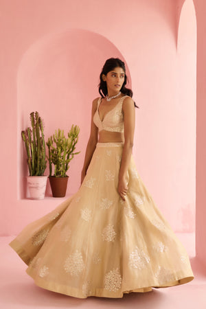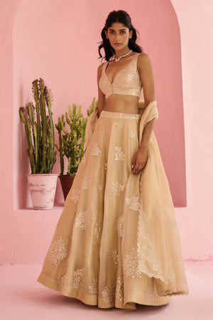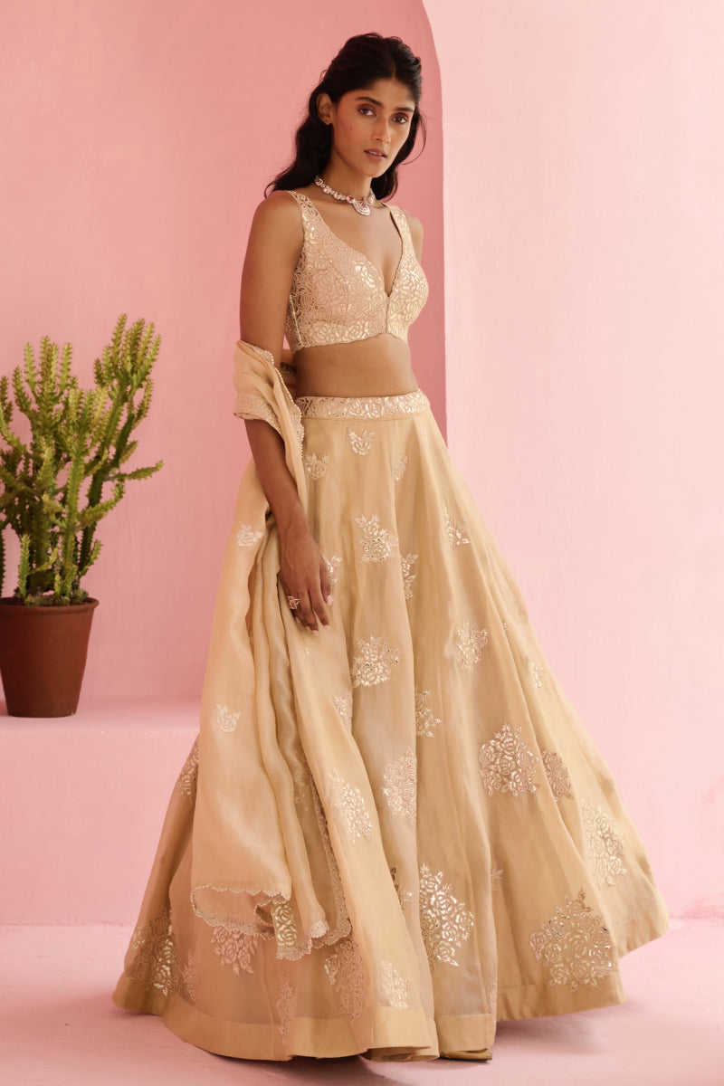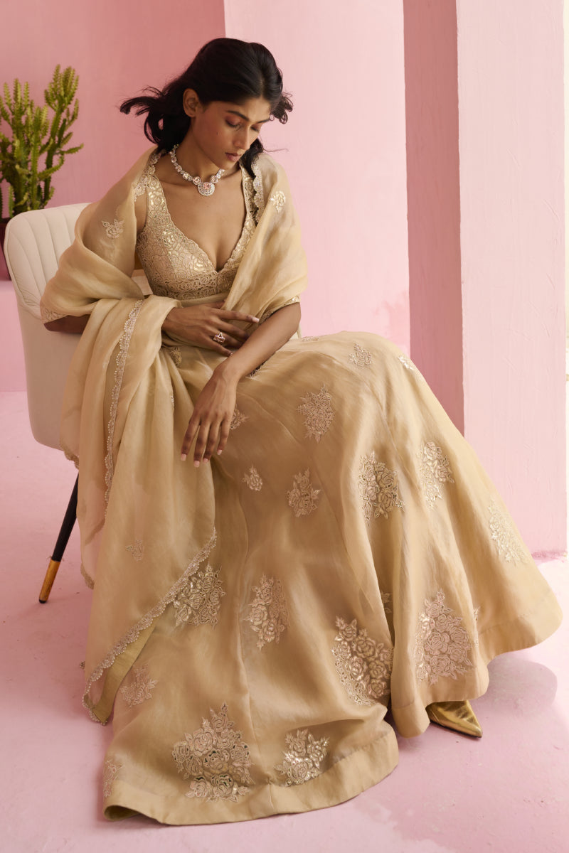 Thread and faux metallic leather embroidered sweetheart neck raw silk blouse paired with faux metallic leather rose embellished organza lehenga and organza dupatta.
