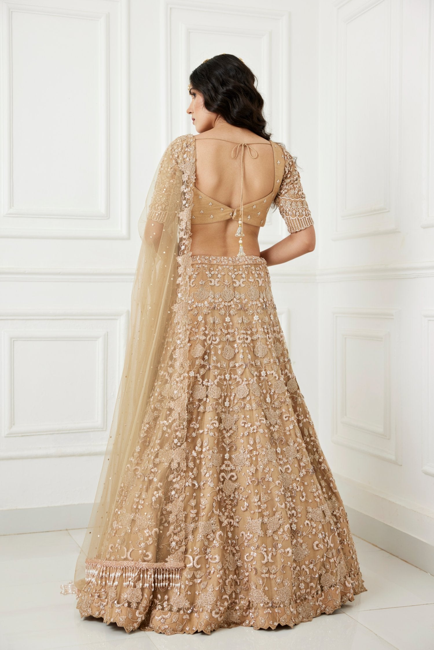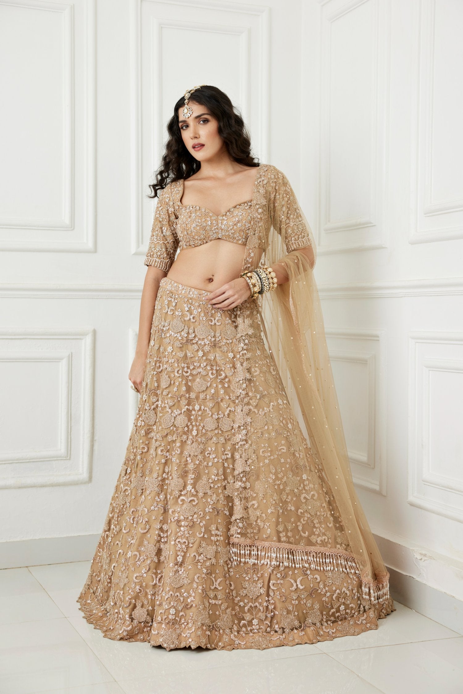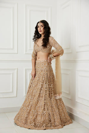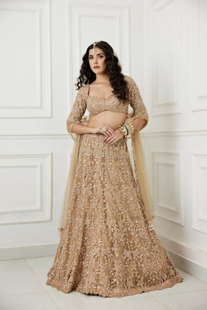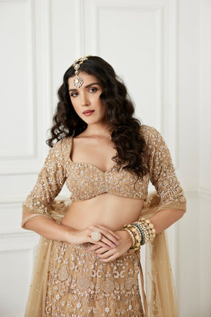 A Floral Embroidered Gold Tulle Lehenga Paired With An Elbow Sleeve Blouse With Cutdana,Zardozi And Sequence Work Detailing And A Matching Tulle Dupatta Having Glass Beads And Pearl Tassel Edges