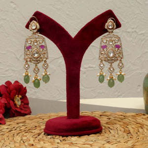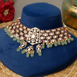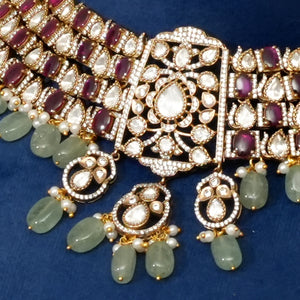 A modern–traditional demi-fine ruby and mint choker featuring delicate mint pearl drops for a soft, elegant finish. Designed with a fully flexible structure, this choker sits comfortably on the neck and is crafted with lightweight, skin-friendly 18kt gold-plated detailing. A versatile piece that works beautifully for festive, bridal, and contemporary styling.