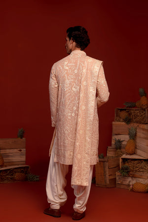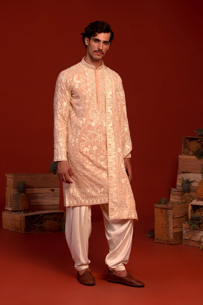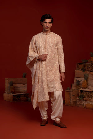This reshom and sequinned embroidered kurta comes with two functional pockets and a soft viscose lining for added comfort. The set is completed with an ivory Patiala and a stunning embroidered dupatta, making it a standout festive choice.