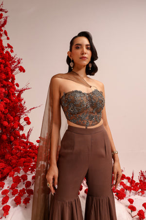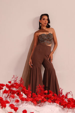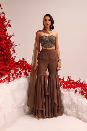 Brown tube top with dori work embellished with sequence and pipes. Paired with double layered sharara and draped dupatta