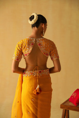 Our Afsa Saree is crafted from luxurious Silk Organza threads, adorned with detailed Dabka Zardozi embroidery. It comes with a matching Raw Silk blouse, also intricately embroidered.
