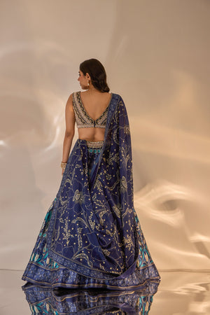 BLUE PRINTED SILK LEHENGA PAIRED WITH A HAND EMBROIDERED BLOUSE AND PRINTED GEORGETTE DUPATTA