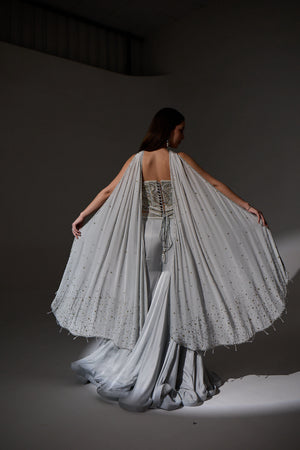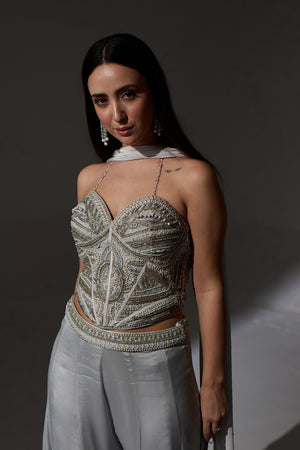 A Victorian-inspired sharara set designed for the modern muse. The look features a structured corset embellished with hand-appliqué and fine aari embroidery, evoking a sense of timeless romance. Paired with a dramatic sharara, detailed with wired hems for sculpted fullness and graceful movement.