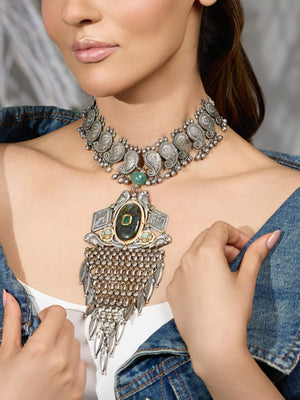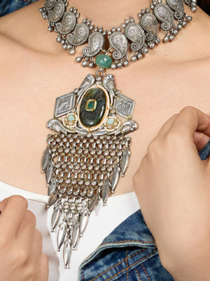 Bold and majestic, this oxidized necklace features a striking spear-like pendant with antique detailing and a central motif. Perfect to wear with traditional attire.