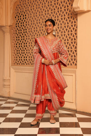 The Aiman ensemble is made from luxurious Silk Chanderi fabric and embellished with our distinctive Kashmiri Tilla Embroidery, complemented by Heritage Mirror work. It showcases a zero neck design with a slit and three-quarter bell sleeves. The Chauga is entirely embroidered with panels and is paired with an embroidered salwar. To complete the look, the Chauga is accompanied by a Khada Dupatta, which features the same exquisite embroidery and can also be worn separately as an Oodhni.