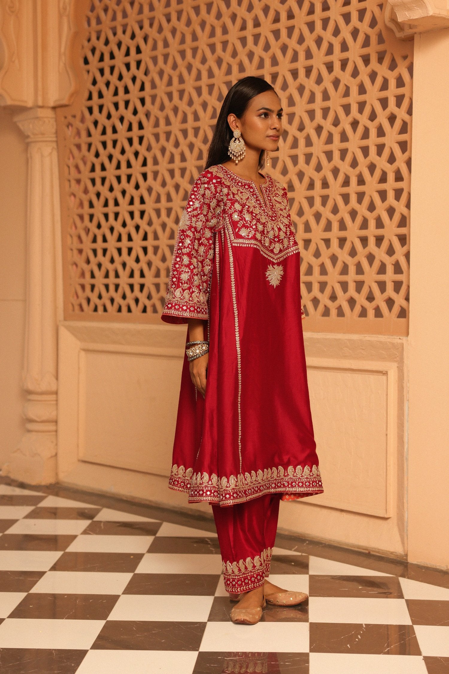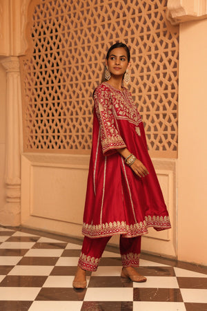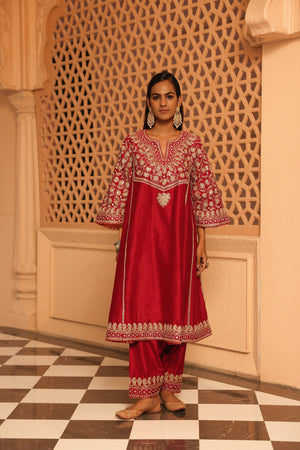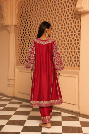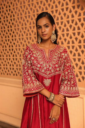 The Aiman ensemble is made from luxurious Silk Chanderi fabric and embellished with our distinctive Kashmiri Tilla Embroidery, complemented by Heritage Mirror work. It showcases a zero neck design with a slit and three-quarter bell sleeves. The Chauga is entirely embroidered with panels and is paired with an embroidered salwar.