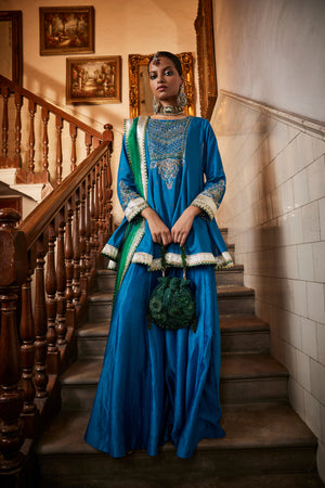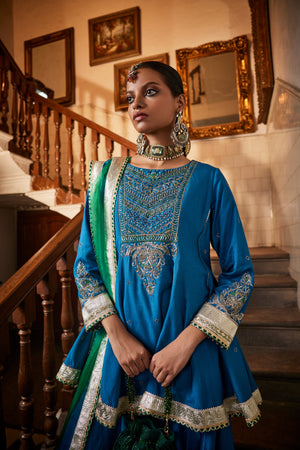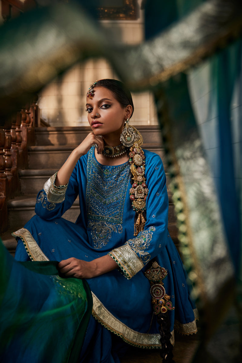 Accessorize the designer anarkali set with statement earrings and heels for weddings, sangeet or engagement ceremonies.