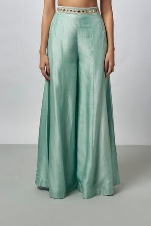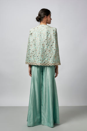 The cape jacket is crafted with intricate floral embroidery, mirror work, and thread detailing along its scalloped edges.. The bralette underneath mirrors the embroidery of the jacket. The trousers complete the outfit with their tailored fit, ensuring comfort and style.