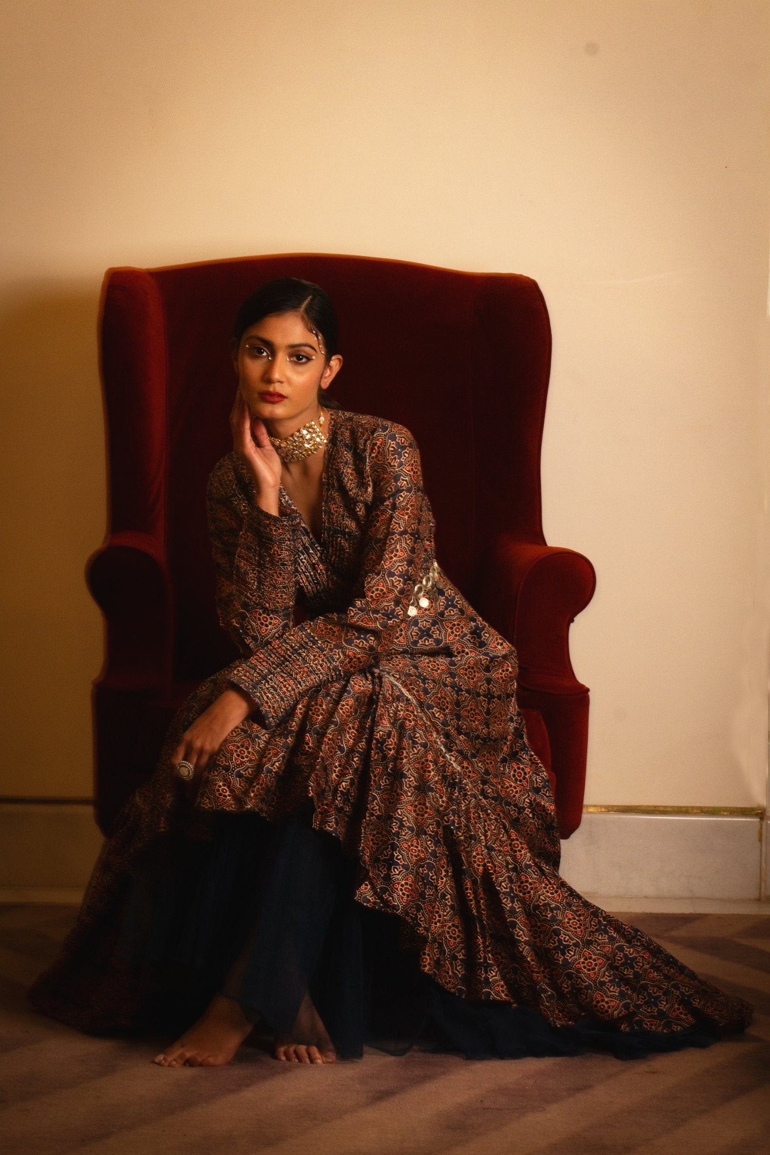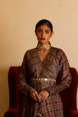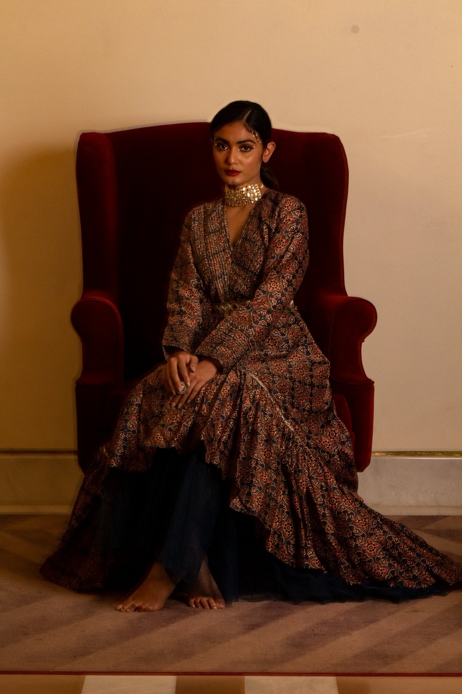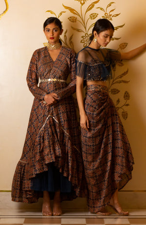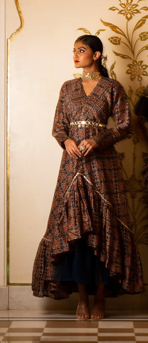 Ajrakh print anarkali dress with pintucks and net pleats detail comes with mirror embroidered belt.