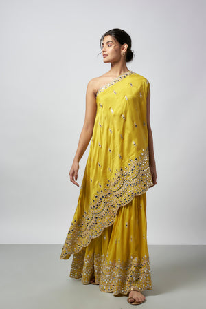 This asymmetrical kurta features mirror work and intricate embroidery scattered throughout and a scalloped hemline with heavy embellishments.Paired with sharara showcasing similar embroidery along the hem.