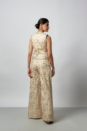 This mirror-embellished vest features a deep V-neckline and scalloped edges.Paired with flowing, wide-leg trousers with delicate embroidery and mirror accents, creating a cohesive and refined ensemble.