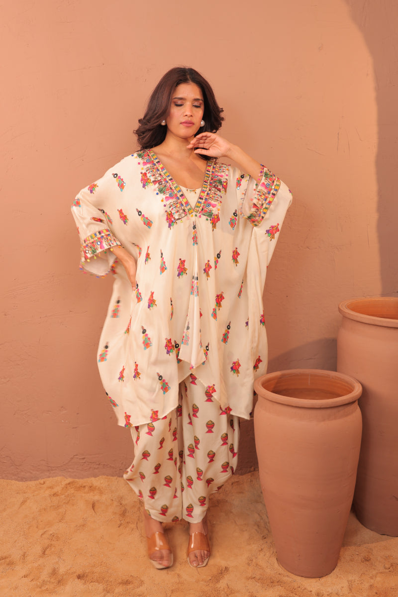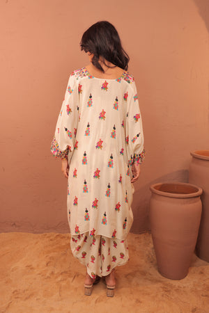 ensemble, comprising a flowing jacket, blouse and dhoti pants,