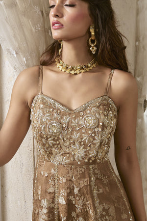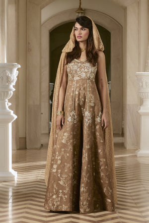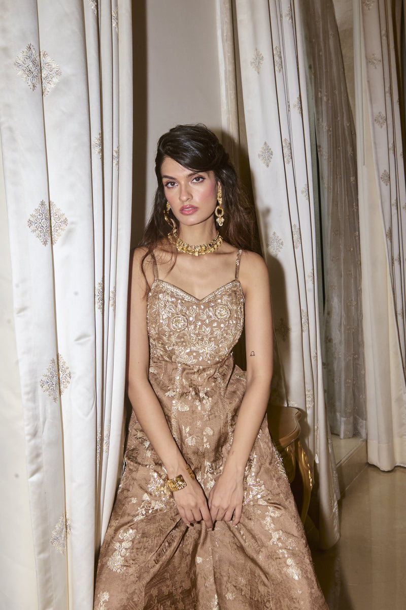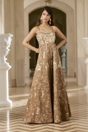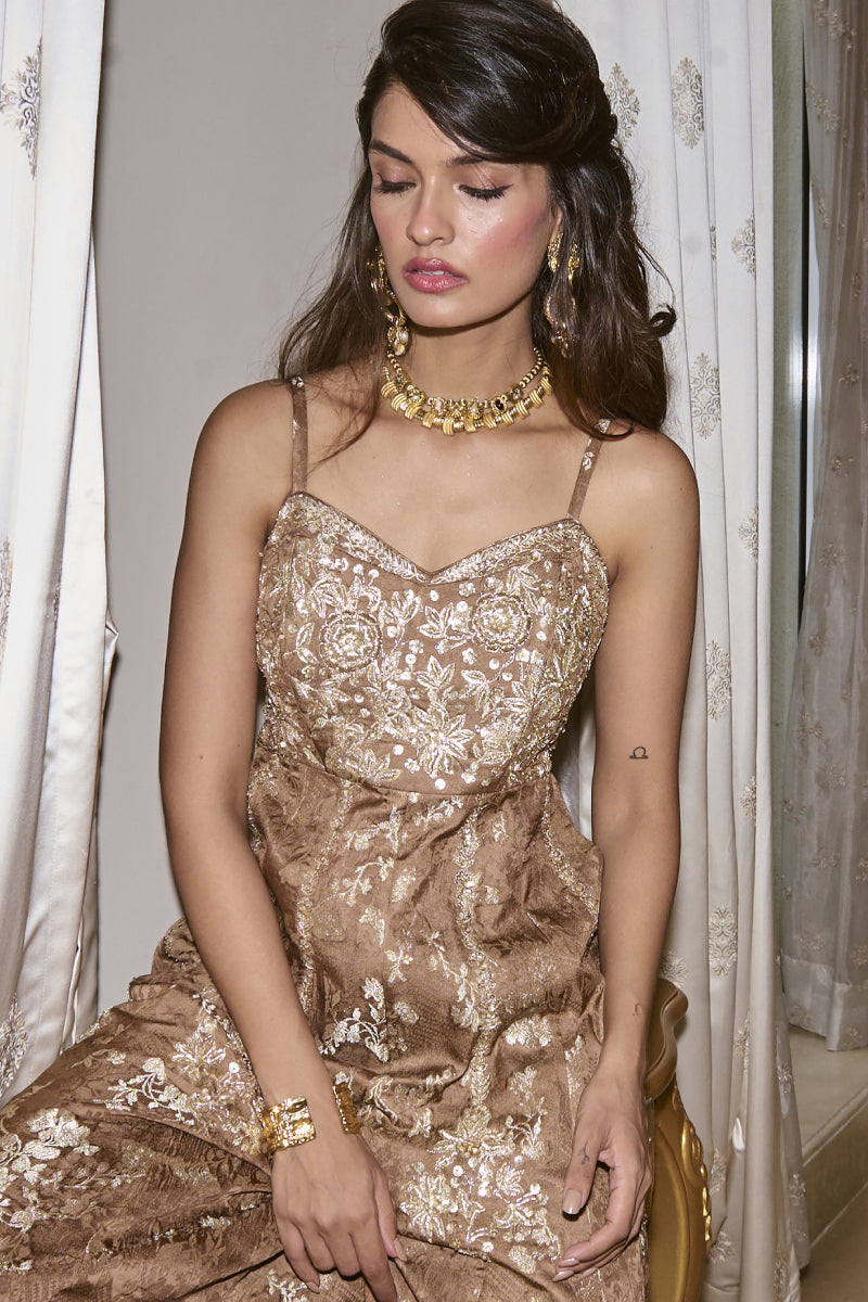 A rich brown jumpsuit crafted in lustrous silver jacquard, featuring a sleeveless silhouette that exudes modern sophistication. The front yoke is fully adorned with intricate zardozi hand embroidery, which gracefully extends below the yoke, adding depth and elegance to the ensemble.