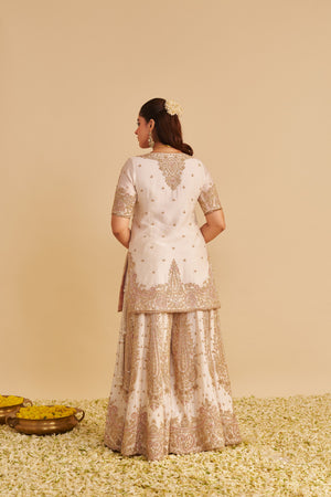 This exquisite ensemble features a short kurta paired with a sharara and dupatta, designed to exude timeless elegance. The kurta is crafted with a broad deep scoop neckline at the front and a striking zero-back design, adding a modern and bold edge to the traditional silhouette. The elbow-length sleeves balance sophistication with comfort, making it a versatile occasion wear choice. The highlight of the outfit lies in its intricate dabka zardozi embroidery, showcasing fine artisanal craftsmanship. The delicate detailing is further enhanced with dangling pearls, lending movement, grace, and a touch of regal charm. Paired with a flowing sharara and a complementing dupatta, this ensemble beautifully blends traditional artistry with contemporary appeal, perfect for weddings, festive occasions, or grand celebrations.