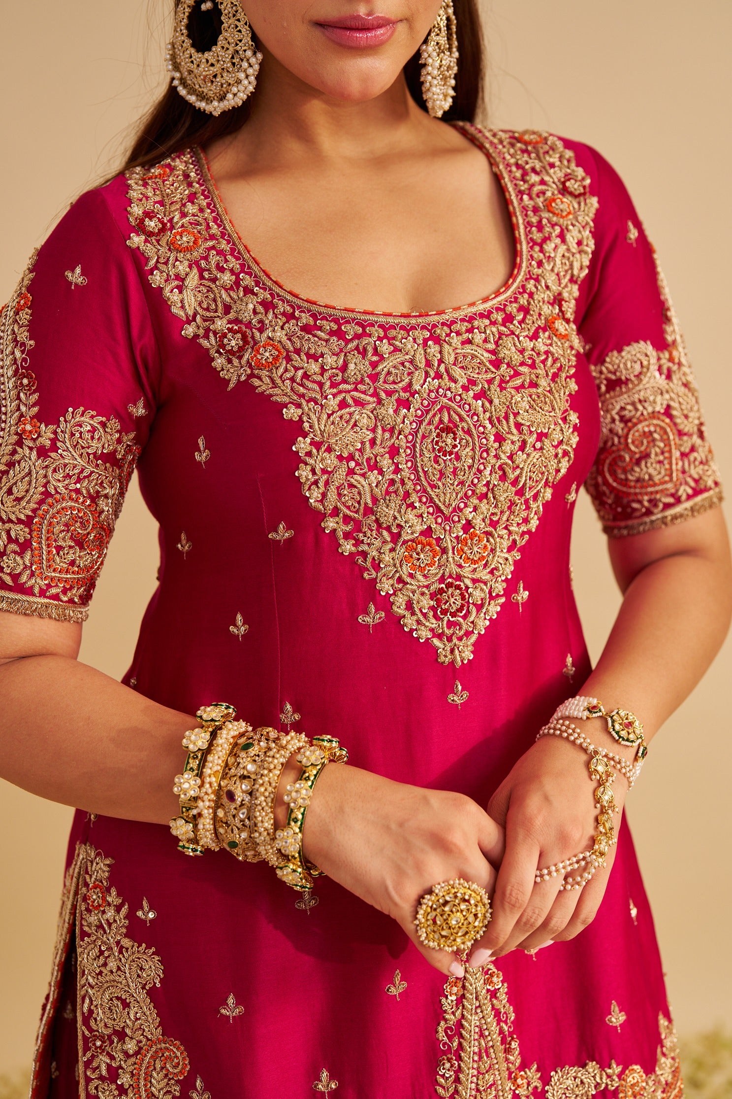 This exquisite ensemble features a short kurta paired with a sharara and dupatta, designed to exude timeless elegance. The kurta is crafted with a broad deep scoop neckline at the front and a striking zero-back design, adding a modern and bold edge to the traditional silhouette. The elbow-length sleeves balance sophistication with comfort, making it a versatile occasion wear choice. The highlight of the outfit lies in its intricate dabka zardozi embroidery, showcasing fine artisanal craftsmanship. The delicate detailing is further enhanced with dangling pearls, lending movement, grace, and a touch of regal charm. Paired with a flowing sharara and a complementing dupatta, this ensemble beautifully blends traditional artistry with contemporary appeal, perfect for weddings, festive occasions, or grand celebrations.