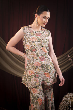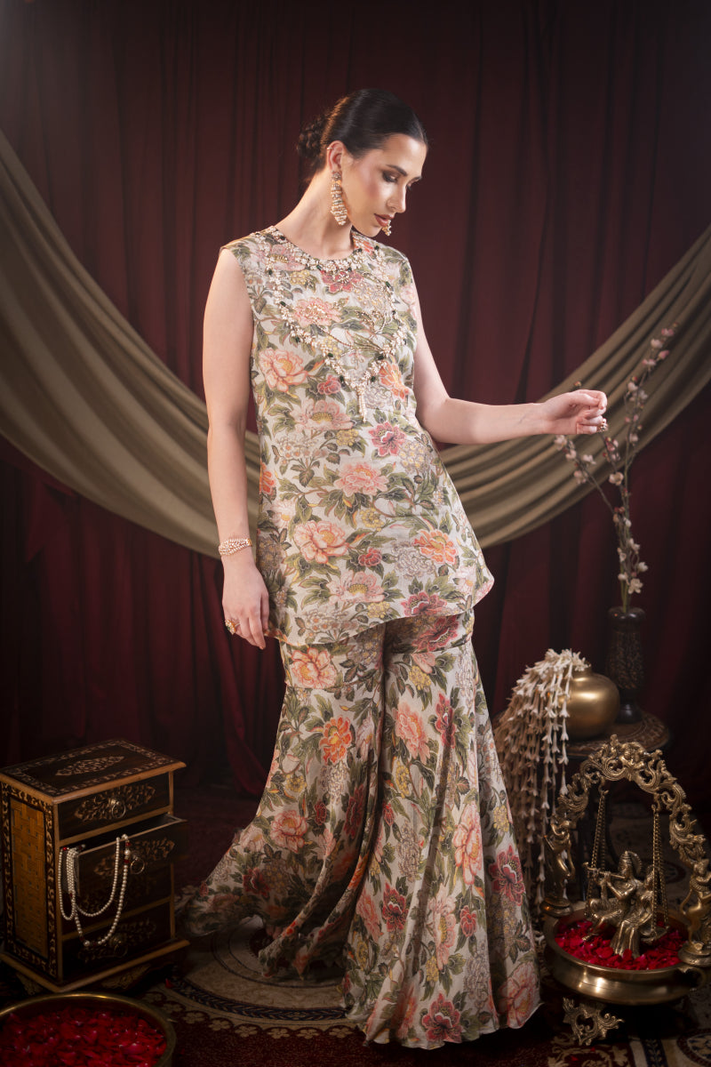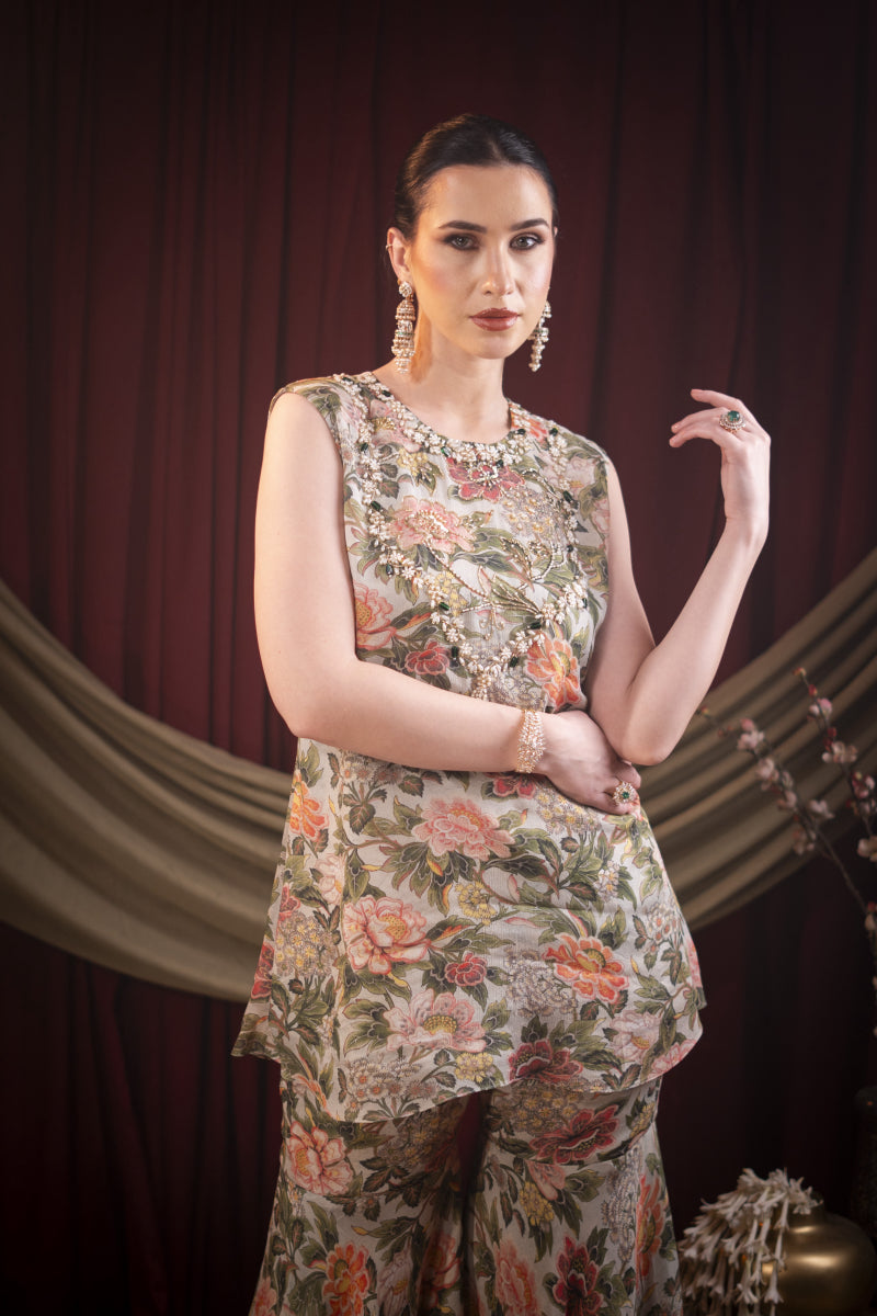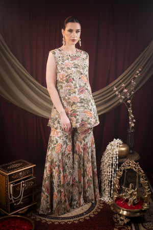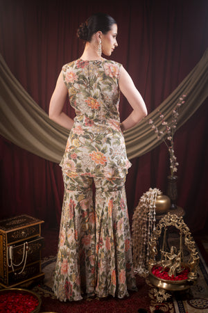 This sharara set is fully embroidered with green stones, dull gold chid, cut dana, pearls, moti etc.