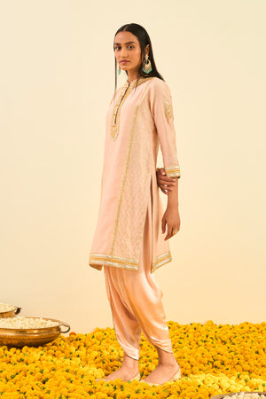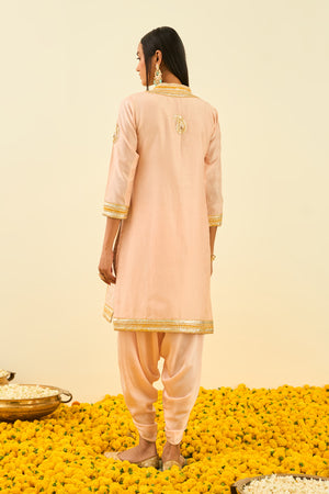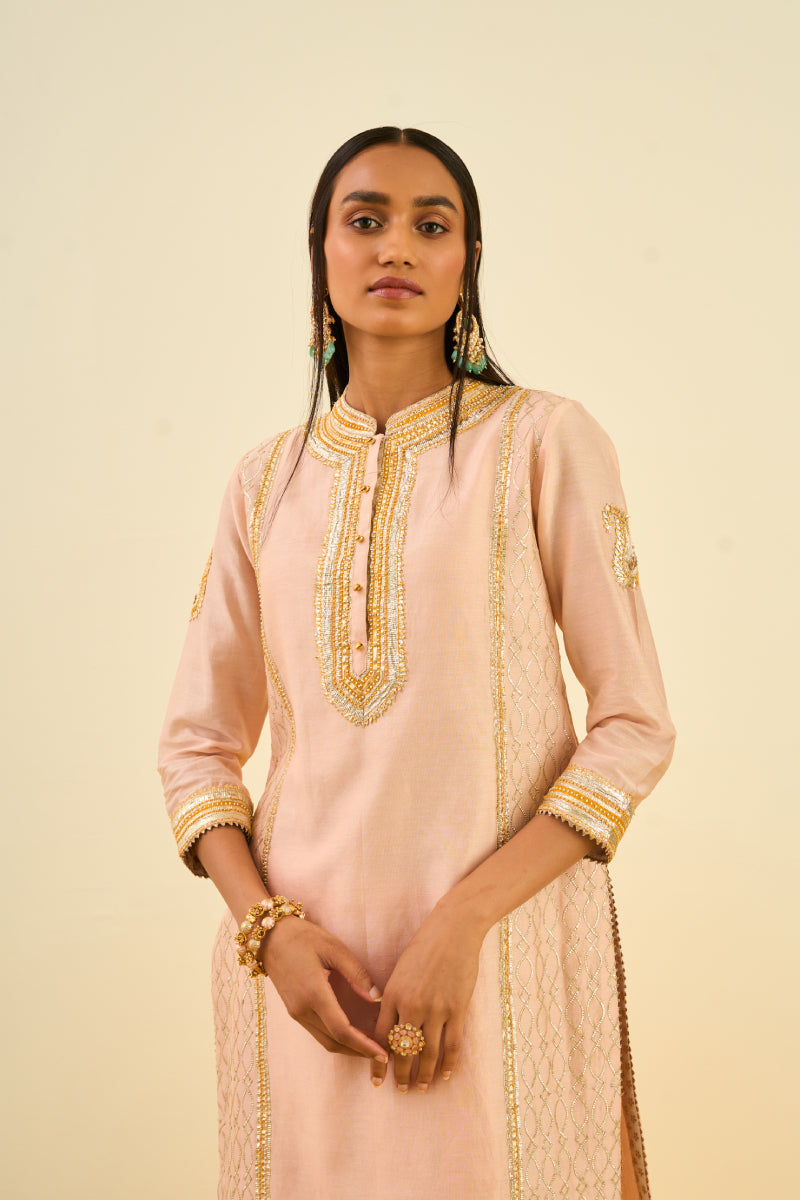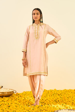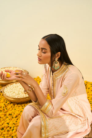 The Aliza ensemble exquisitely crafted with gotapatti and highlighted with basra moti features a mandarin collar with a placket and three-quarter sleeves. The outfit is finished with exclusive Banarasi fabric and Gota.