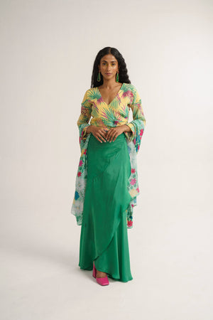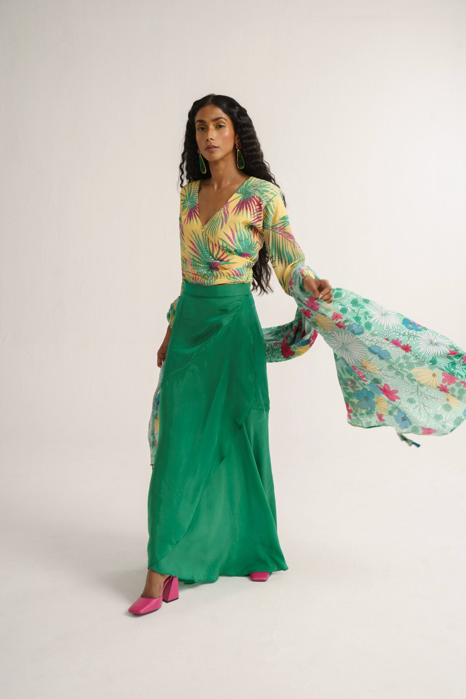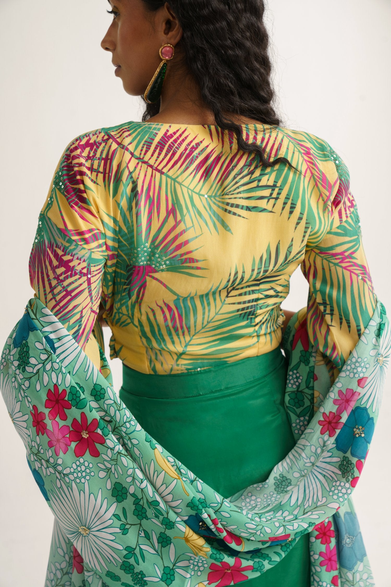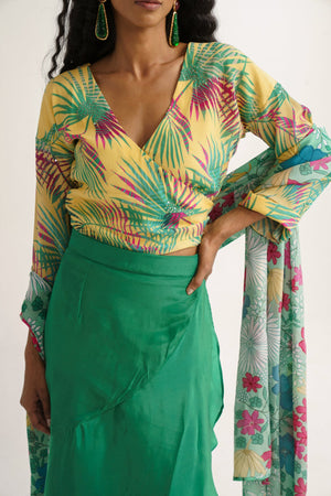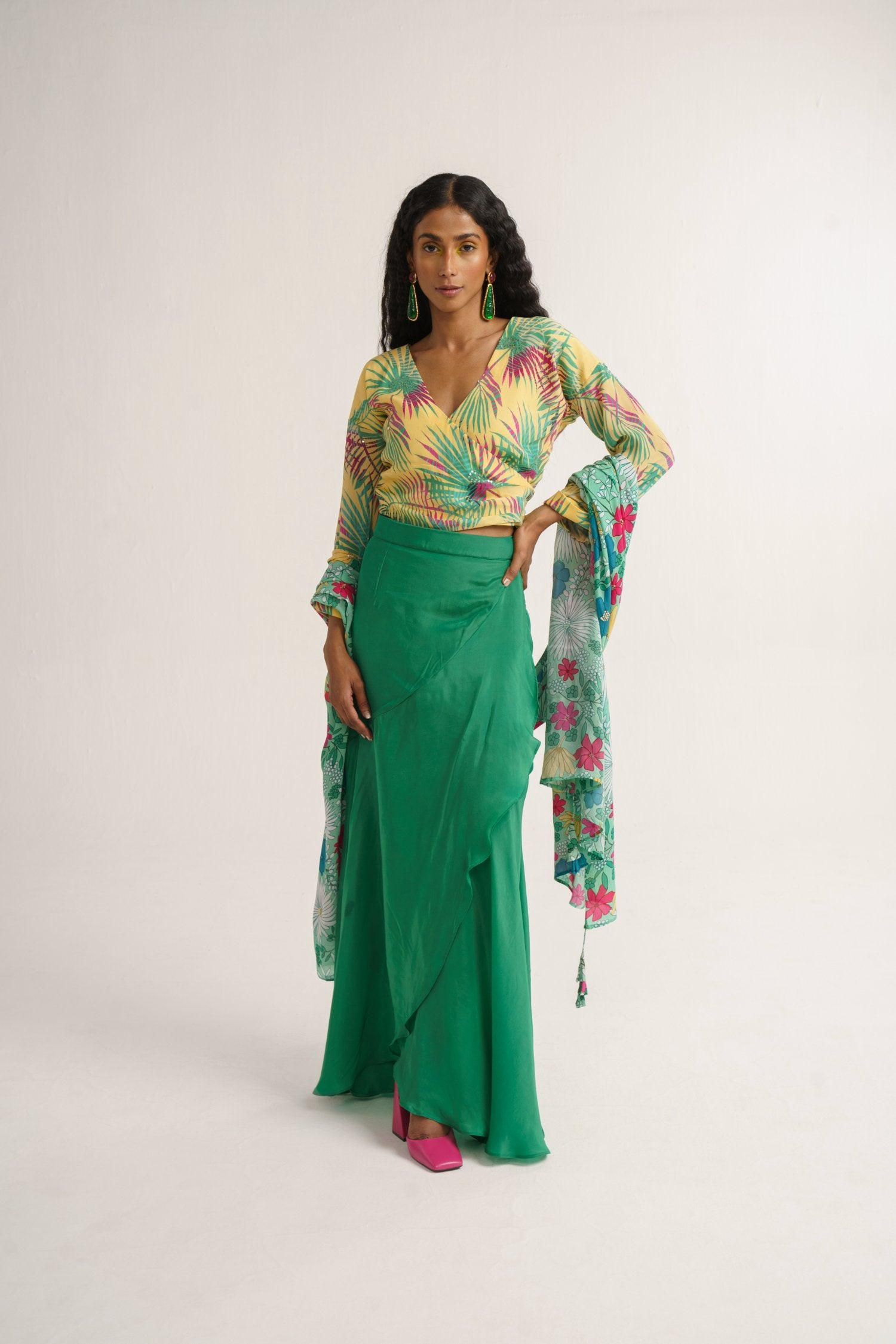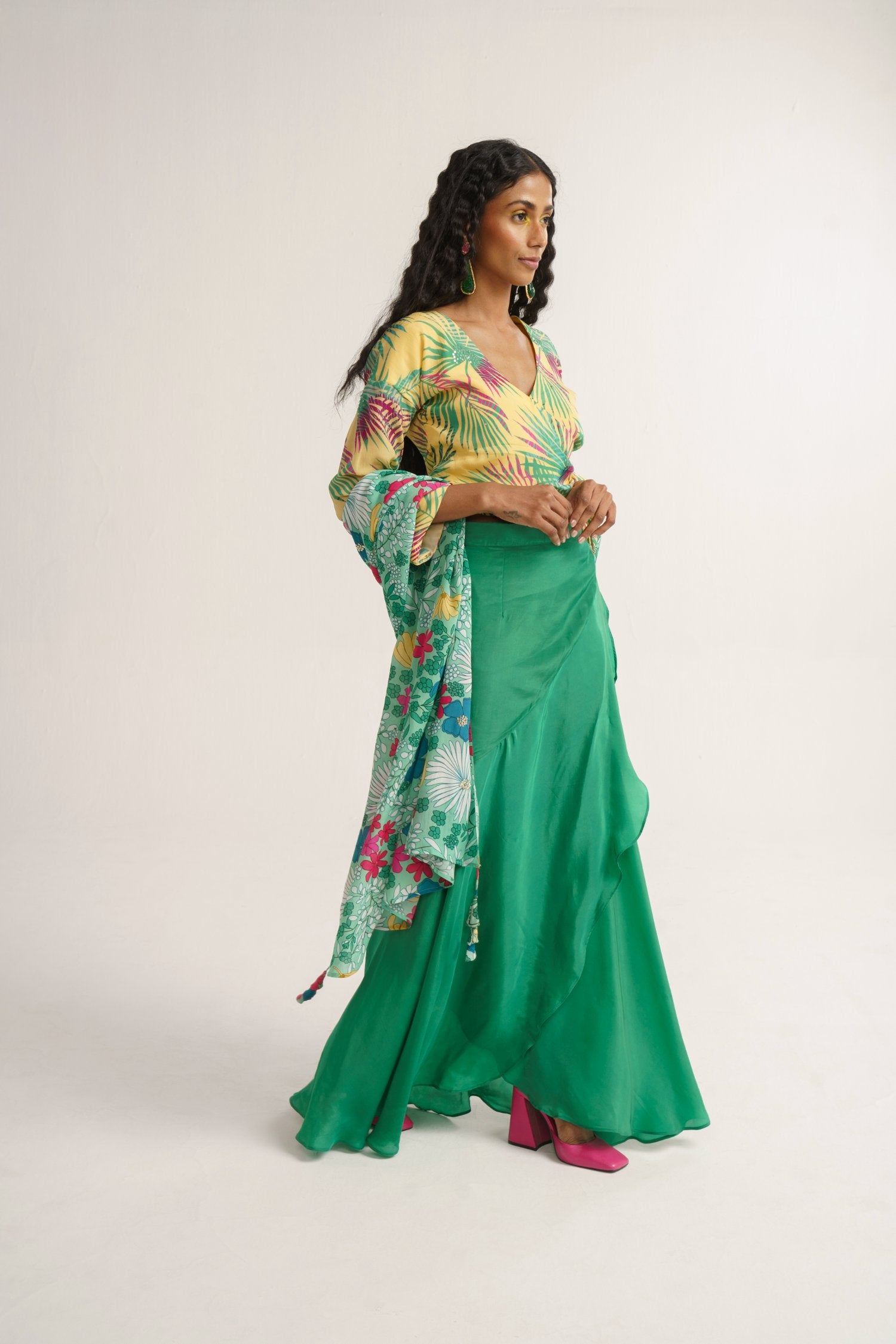> Key features - The set has wrap-around skirt with front opening top and sequence highlighted dupatta.