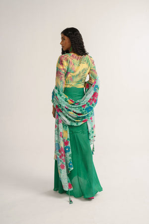 > Surface/embellishment - High definition, multi-coloured, bold floral motifs, digital print, sequence embroidery and tassels.