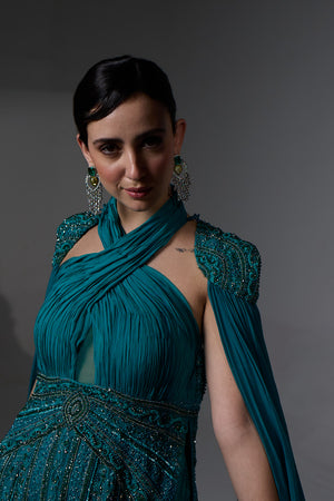 The sharara is crafted with a full circular flair and features a front-attached cowl detail that adds sculptural elegance and graceful movement. Perfect for sangeets, receptions, or any grand celebration, this ensemble celebrates craftsmanship, couture detail, and modern Indian femininity.