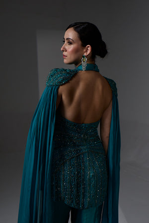 Designed to make an unforgettable impression, this luxe sharara set pairs a short kurti drenched in tonal hand embroidery with contemporary cuts and extended back drapes that bring fluid drama to the silhouette.