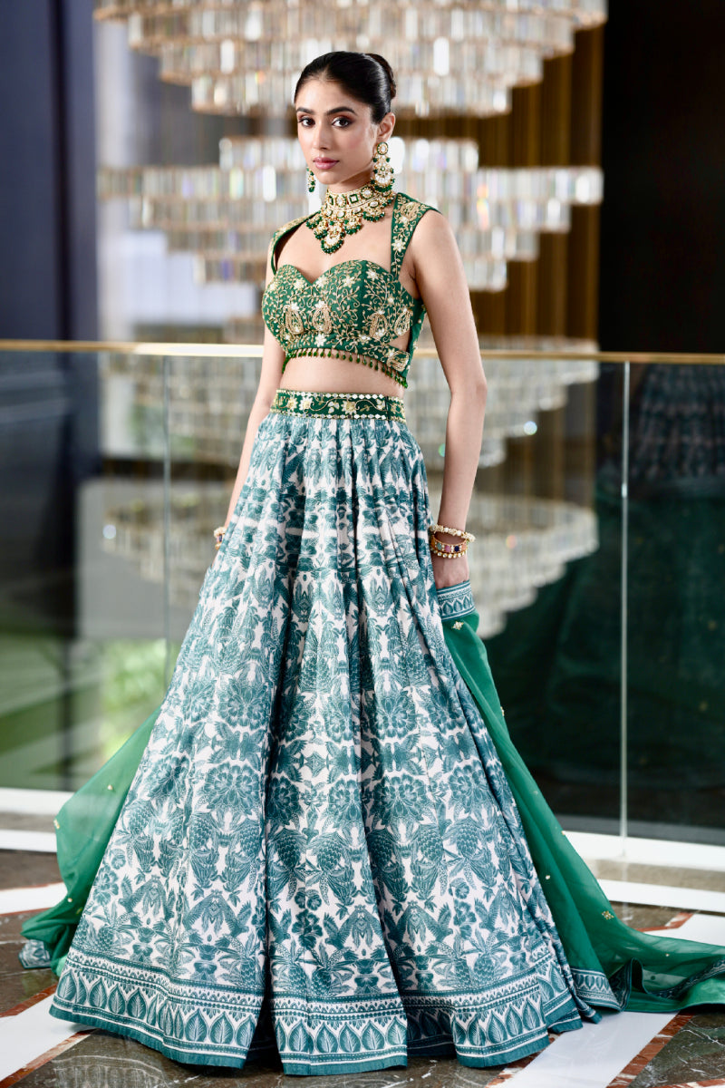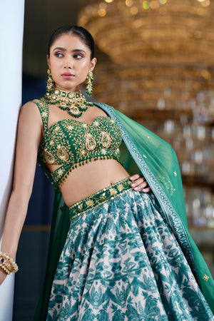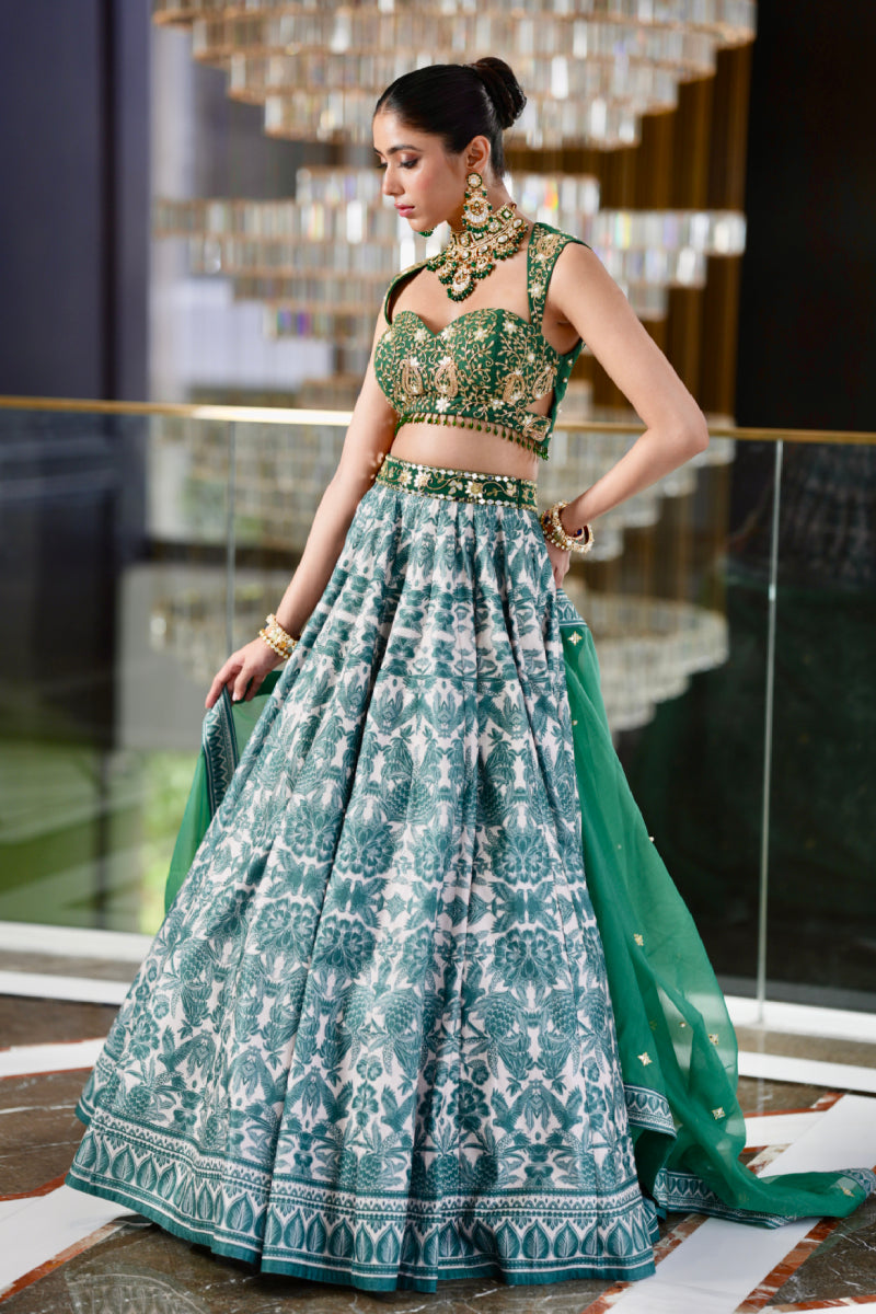 Green Printed Velvet Lehenga with hand embroidered blouse with tassel details and hand embroidered organza dupatta
