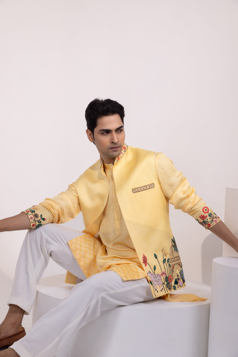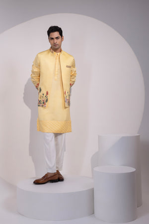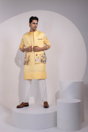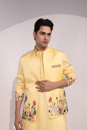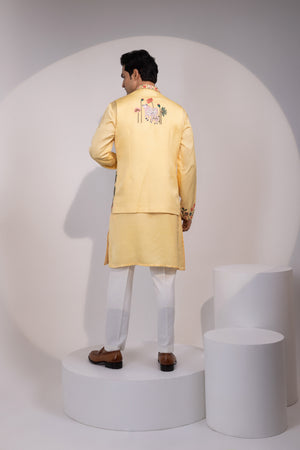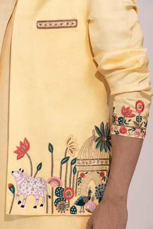 A light yellow kurta and matching sleeveless jacket, paired with off-white pant payjama. The kurta has a wide, patterned border at the hem and colorful, floral embroidery on the cuffs. The jacket is the main focus, featuring detailed, vibrant threads embroidery on the front panels. This embroidery depicts a unique landscape scene with stylized trees.