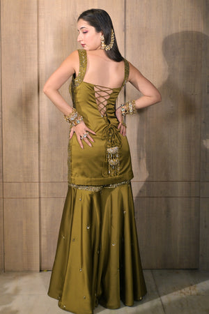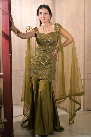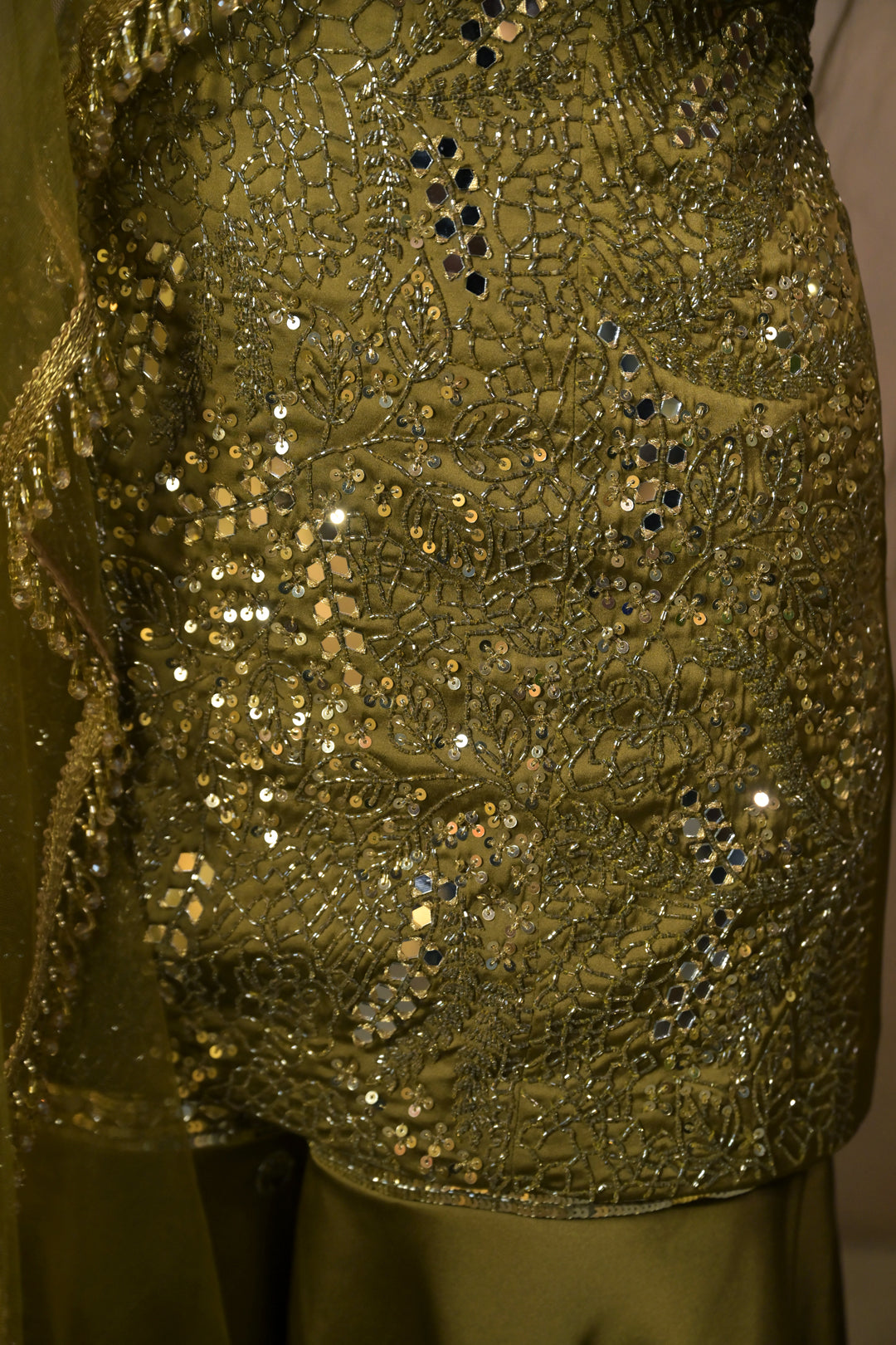 A celebration of effortless elegance, the Amara Garara Set in olive green is hand-embroidered with cutdana, beads, and sequins that sparkle with every move. Made from wrinkle-free fabric for all-day comfort and style, it features flowy garara pants and a graceful kurta—perfect for Mehendi functions, Sufi Nights, or festive celebrations.