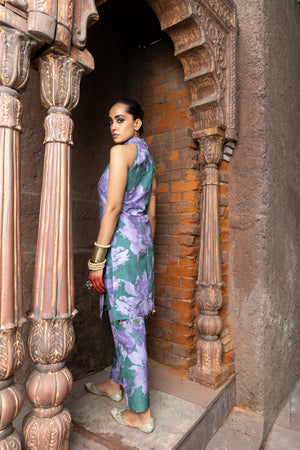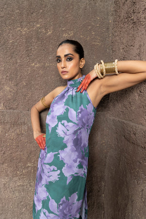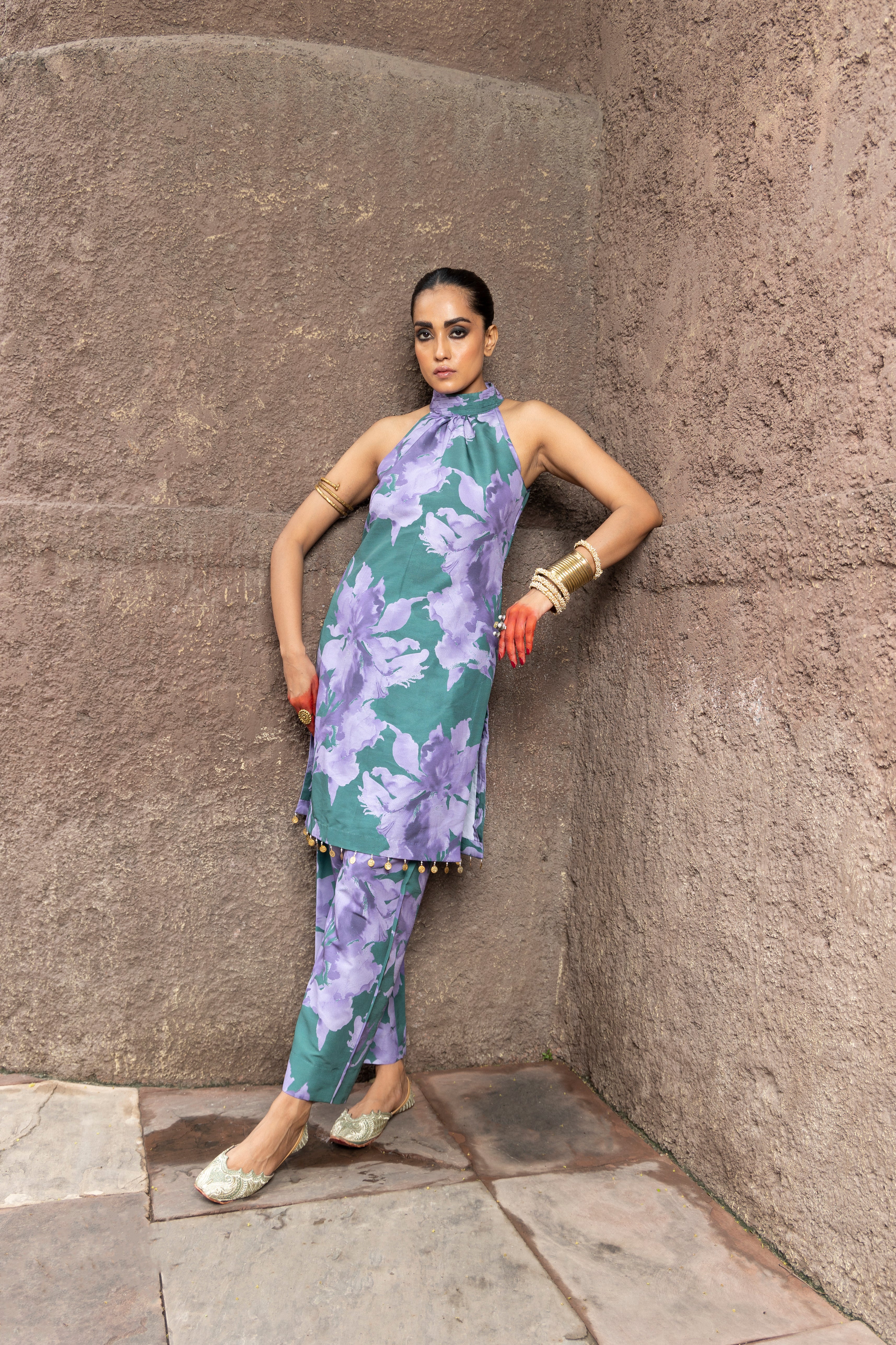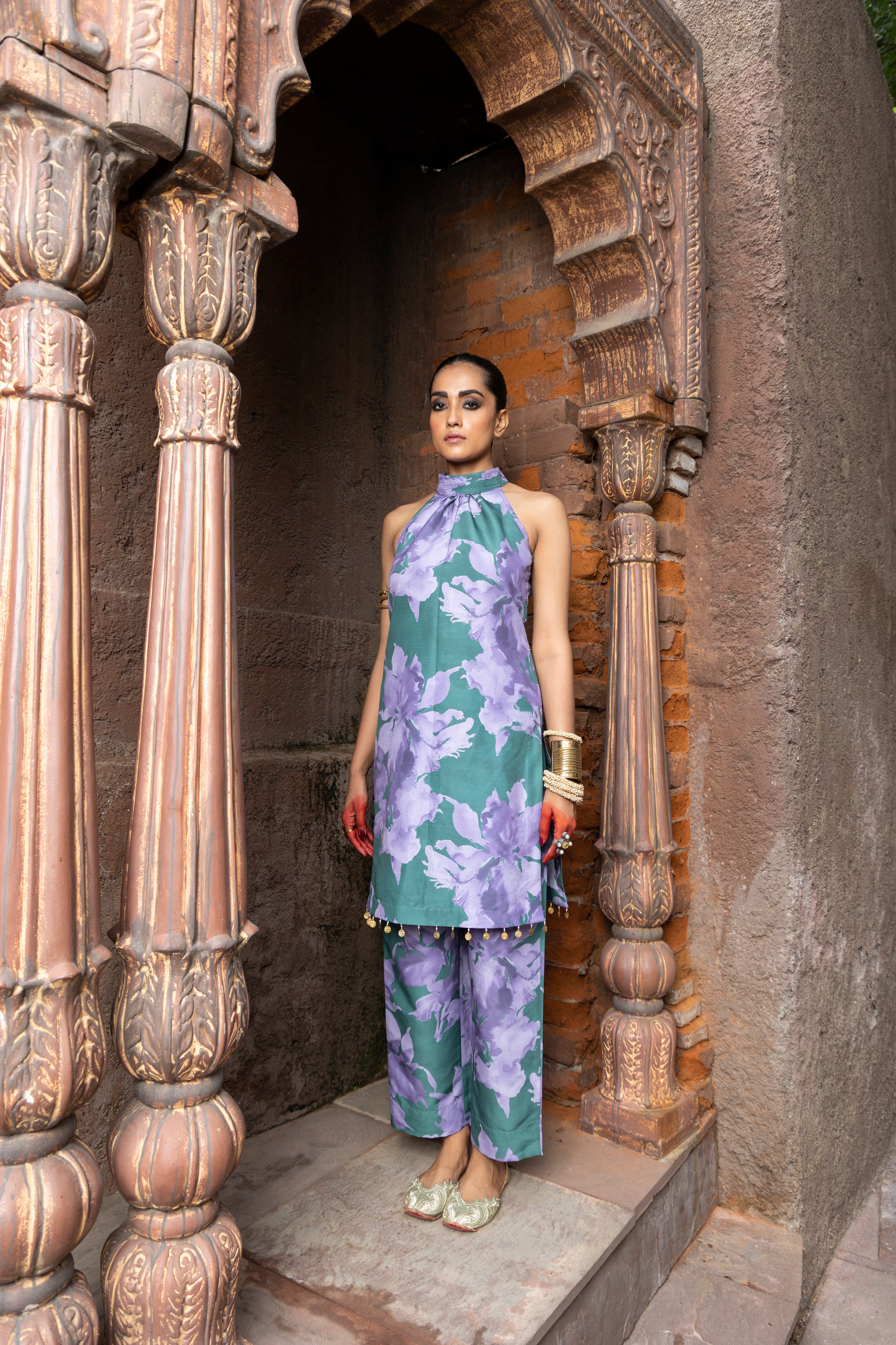 Our Custom 'Amara' Print Is Seen Here In Our Orchid And Emerald Kurta Set. Day To Evening In Our Contemporary Printed Kurta Featuring A Halter Neck And Cowri And Coin Details. The Kurta Is Paired With Matching Printed Pants.