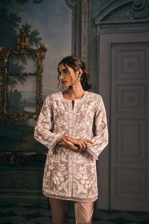 Elevate your occasion wardrobe with this exquisite jacket kurta and pants ensemble, a statement in artisanal craftsmanship and modern sophistication. The jacket kurta is adorned with delicate thread embroidery and intricate embellishments, lending a rich texture and timeless elegance to the silhouette. Subtle tassel accents add a touch of fluid grace, enhancing the couture appeal of this piece. Paired with straight-cut pants finished with tasseled borders, the look strikes a perfect balance between structure and fluidity. The refined detailing creates an understated shimmer, while the thoughtful design ensures effortless wearability. This ensemble exudes contemporary charm while remaining deeply rooted in traditional artistry, making it both versatile and enduring. Ideal for wedding soirées, festive celebrations, and elegant gatherings, this set is crafted for the modern woman who seeks luxury in every detail. With its graceful silhouette and impeccable finish, it is a wardrobe treasure that embodies sophistication with a distinctive edge.