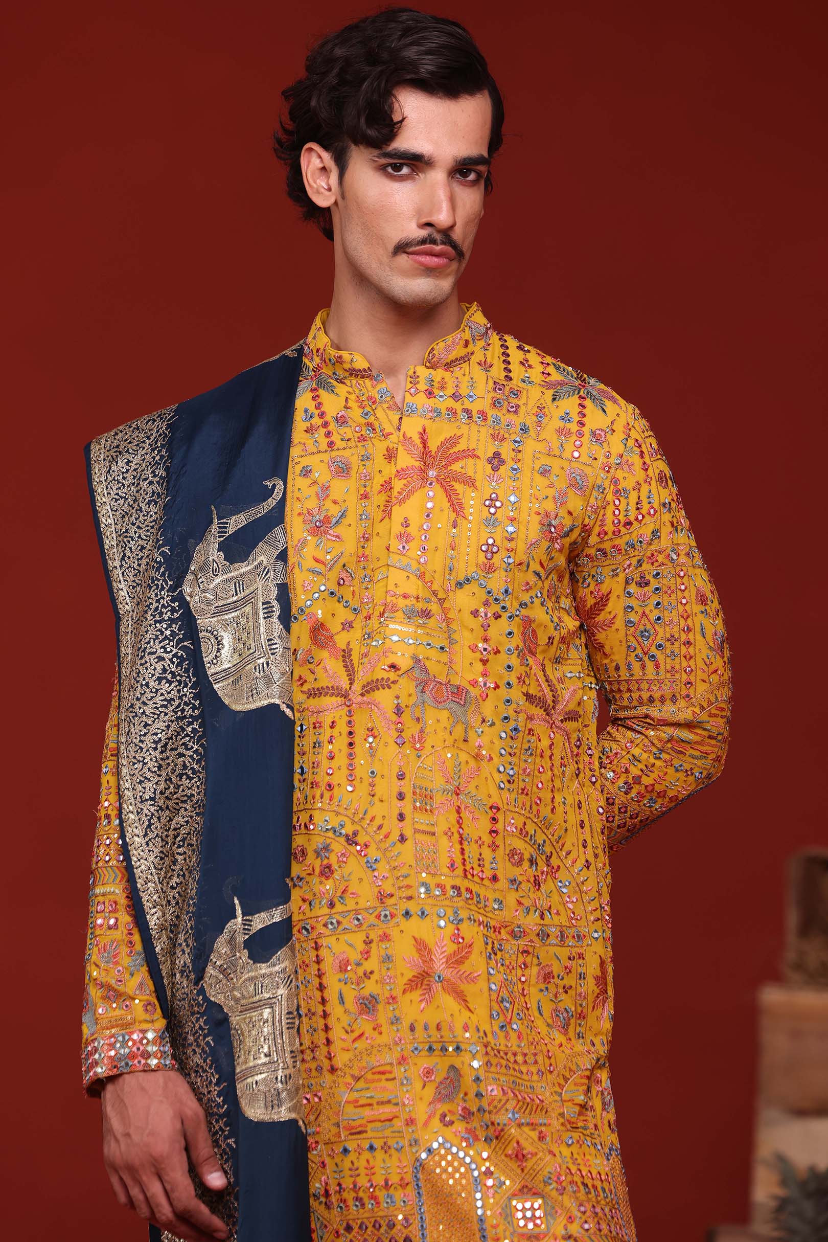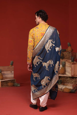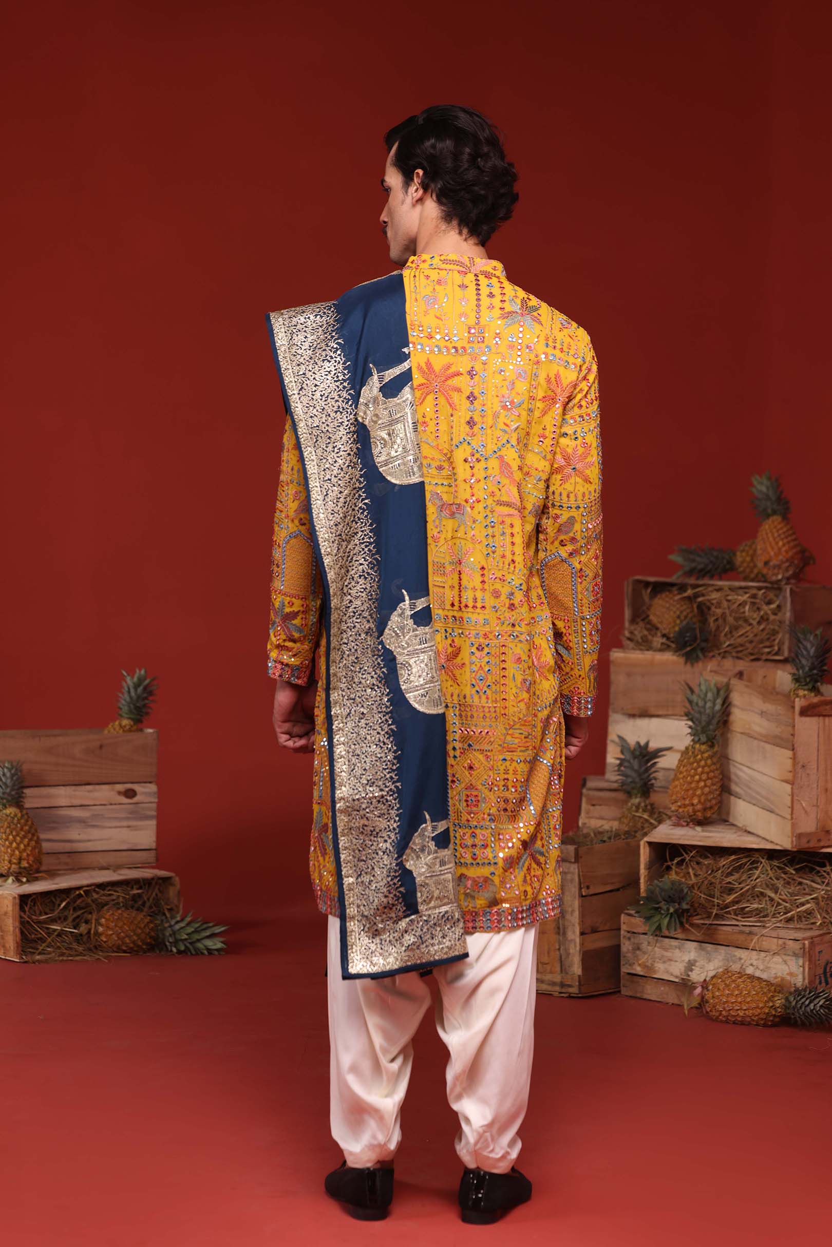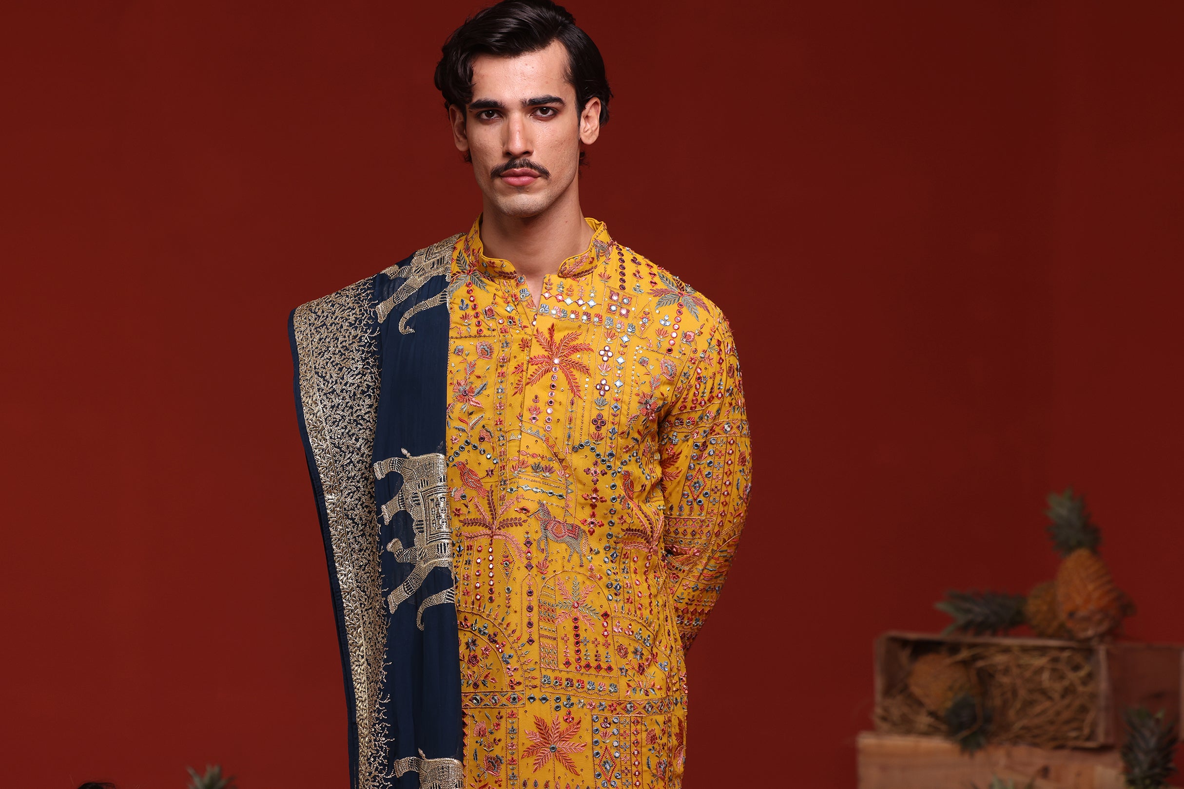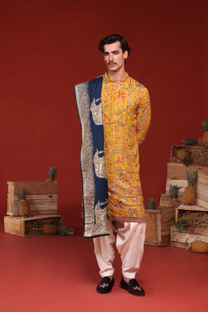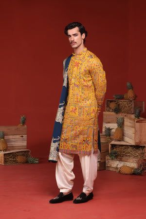 This elegant kurta features exquisite reshom and sequinned embroidery, paired with a heavily embroidered dupatta for a regal look. The kurta includes two functional pockets and is lined with pure viscose for comfort, making it a perfect match with the ivory-colored Patiala.