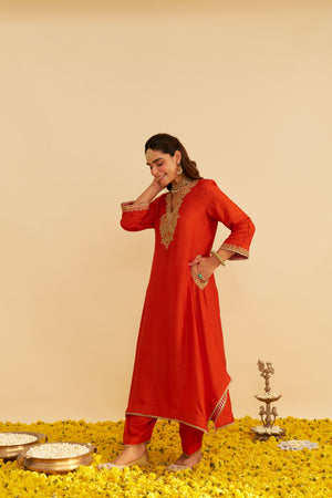Paired with a traditional Dogri salwar, the ensemble is completed with contrasting Banarasi fabric and gota accents, enhancing its festive and sophisticated appeal.