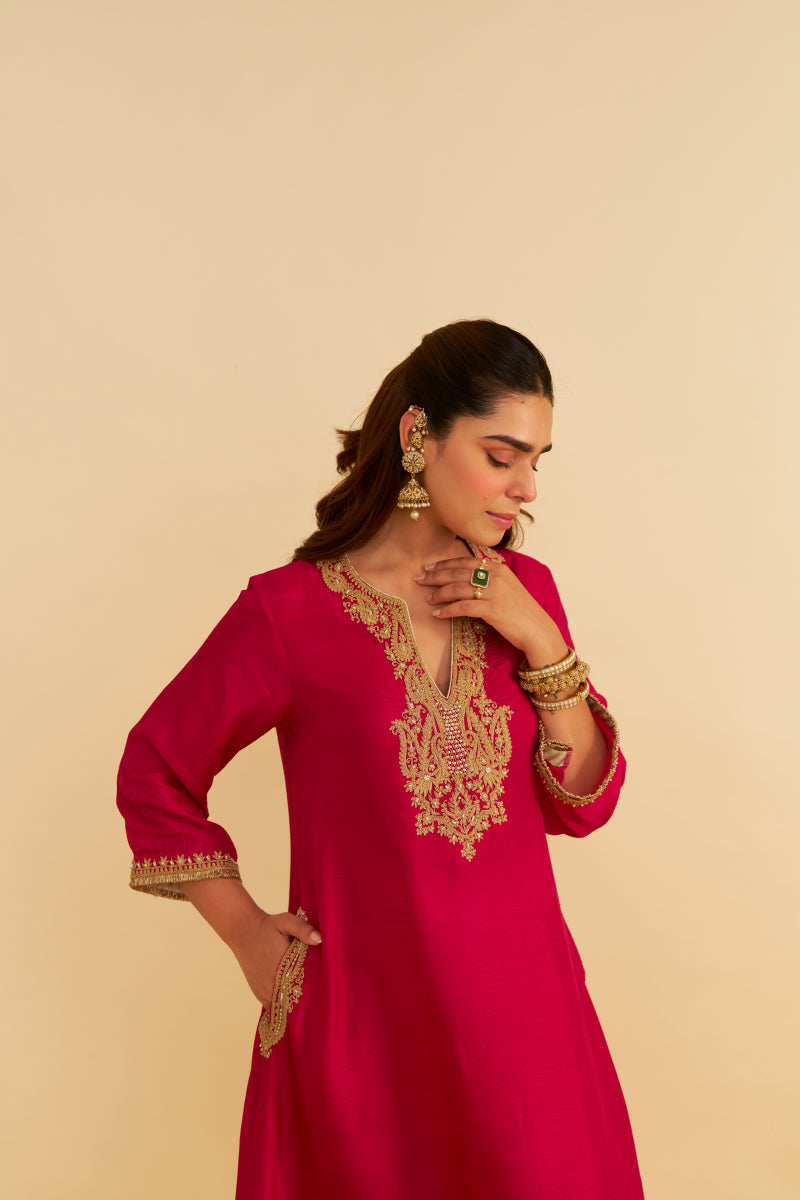 Paired with a traditional Dogri salwar, the ensemble is completed with contrasting Banarasi fabric and gota accents, enhancing its festive and sophisticated appeal.