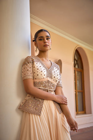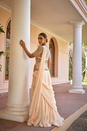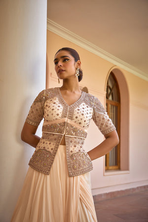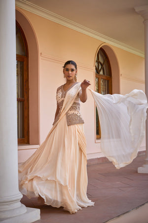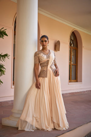 Featuring a mesmerizing Drape and layered concept saree. Paired with an intricately embroidered tilla, gota and zardozi work jacket. Redefine elegance with this modern yet traditional and effortless saree set for cocktail or reception look.
