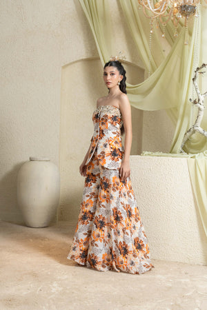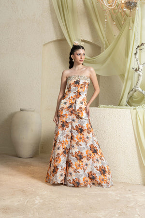 The Amber Field Hand-Embroidered Corset & Pant Set exudes effortless modern charm. The structured, delicately hand-embroidered corset sculpts the silhouette, while the wide-legged printed pants flow with graceful movement. The warm floral palette makes it perfect for sundowner cocktails, destination weddings, and elegant festive gatherings.