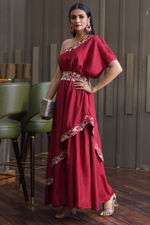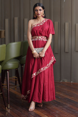 Maroon hand embroidered croma silk one shoulder gown with hand embroidered belt.