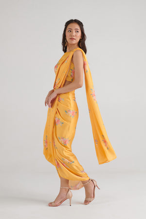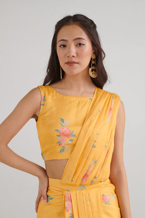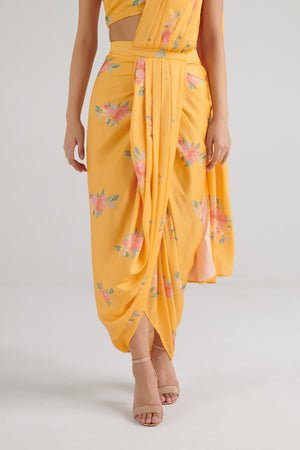 This amber yellow floral top features a stylish V-cut at the bottom, creating a chic and trendy look. Paired with a draped skirt saree, it's perfect for any festive or casual occasion. Enjoy comfort and style in this beautiful ensemble that blends tradition with modern fashion.