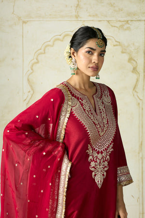 The straight-cut kurta is richly detailed with heavy embroidery along the neckline, sleeves, and hemline, creating a statement of timeless elegance. Paired with a flowy sharara adorned with intricate border, the ensemble exudes festive charm. The sheer dupatta, finished with delicate embroidery and a broad embellished edge.