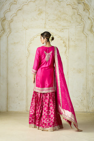 The straight-cut kurta is richly detailed with heavy embroidery along the neckline, sleeves, and hemline, creating a statement of timeless elegance. Paired with a flowy sharara adorned with intricate border, the ensemble exudes festive charm. The sheer dupatta, finished with delicate embroidery and a broad embellished edge.