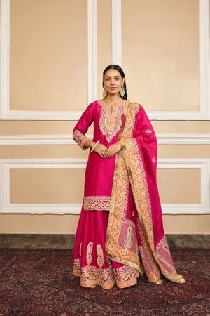 This ensemble is made in pure silk chanderi fabric and adorned with heritage Kashmiri Tilla Embroidery. It features a zero neck with placket, three-quarter sleeves. The whole ensemble is highlighted with appliqué, gota and is finished using a chanderi silk banarsi fabric and gota. The odhni is finished is finished with kinari.