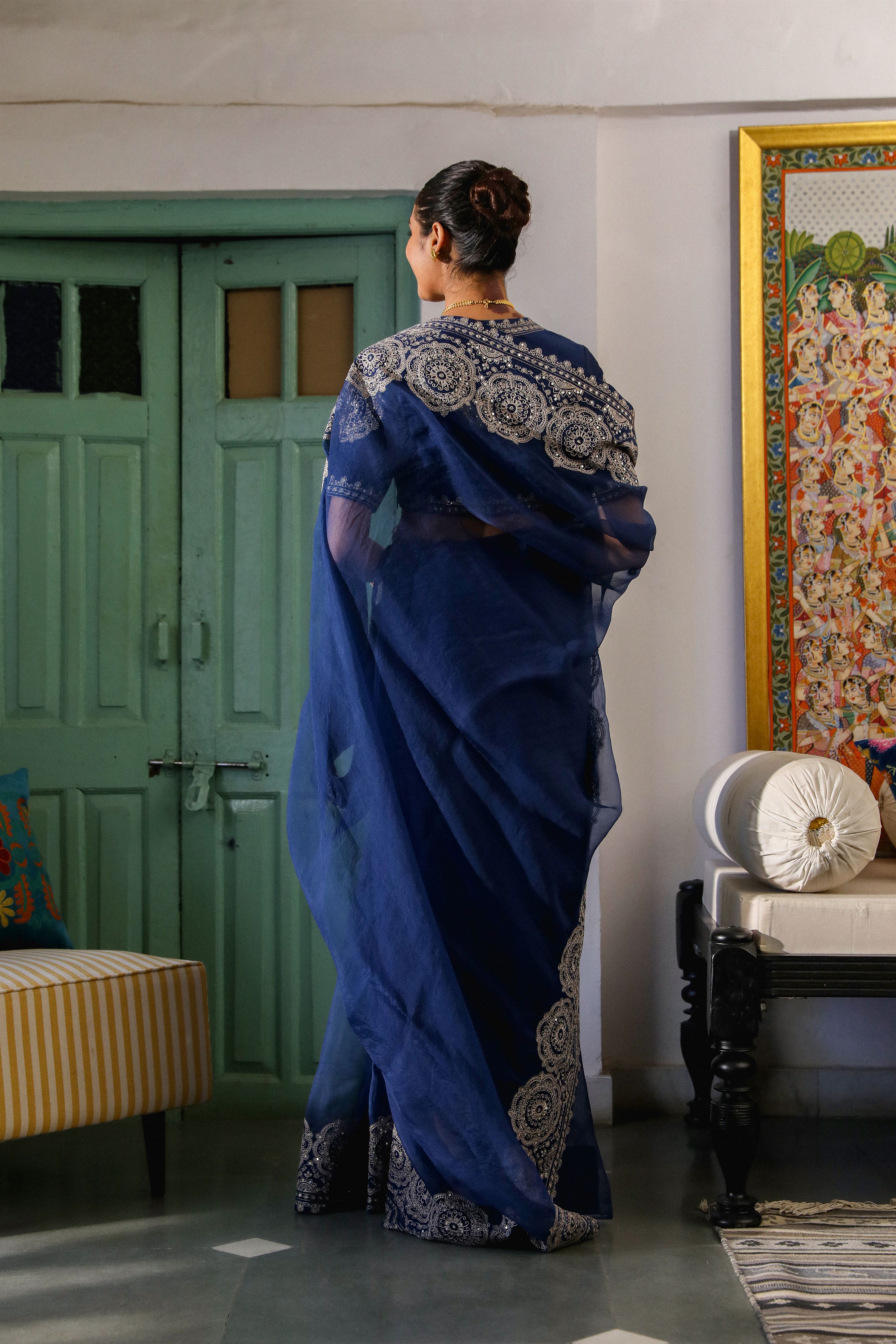 Navy blue embroidered saree with embroidered tonal blouse