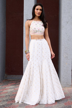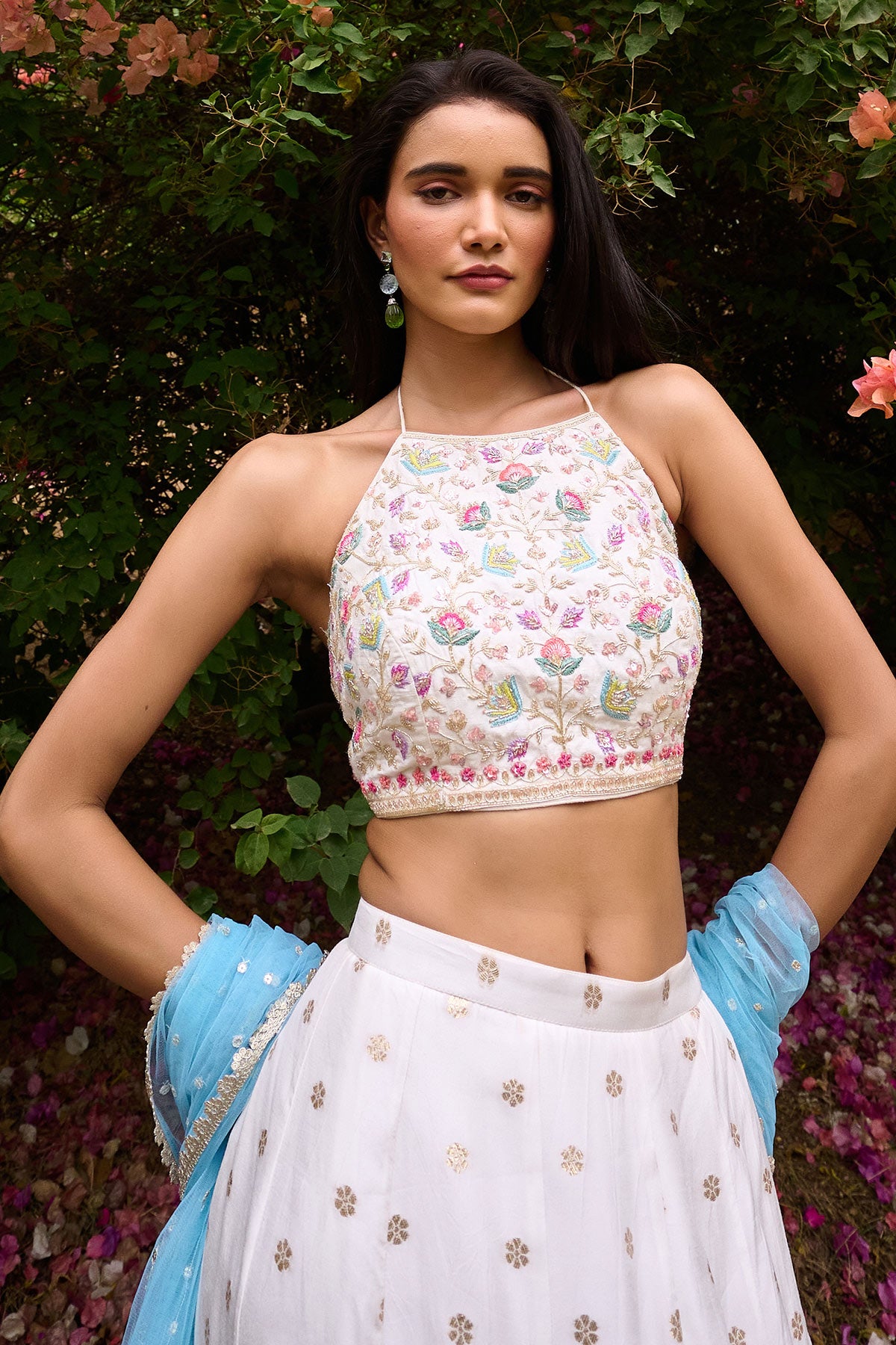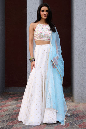 Ivory Jamewar gusset skirt paired with thread and beads embellished halter neck blouse and contrast powder blue tulle dupatta