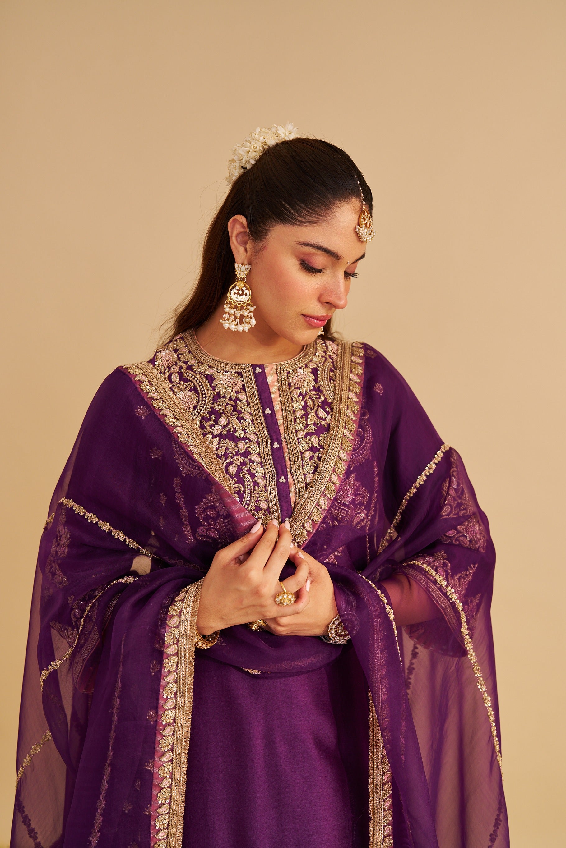 This regal long A-line ensemble is crafted in luxurious pure silk chanderi, paired with flowing palazzos and a delicate silk organza dupatta. The silhouette features a zero neckline with placket and three-quarter bell sleeves, combining elegance with contemporary charm.