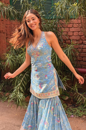 The sharara pants feature a voluminous flare, finished with an ornate embroidered border that mirrors the detailing on the kurti. Completing the look is a sheer net dupatta with scattered sequin butis and a stunning embroidered border.